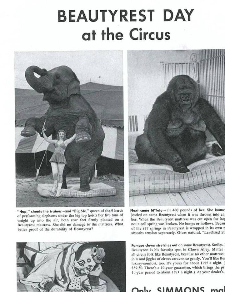 1950年,“马戏团”主题,见证独立袋装绷簧惊人的支撑力,即使是体积分量巨大的猩猩与大象,都能够得到完美支撑与舒适,且床垫没有遭到任何损坏,显现Simmons席梦思Beautyrest?甜梦床垫巩固的床垫结构。