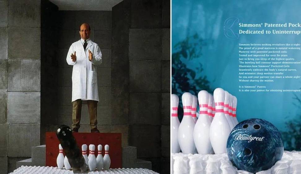 1995年,“保龄球”主题,将保龄球从高处落下,摆放于落点周围的球瓶都不会倒下,文风不动,生动诠释了奇特的独立袋装绷簧技能供给的无搅扰特性。